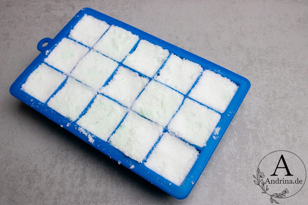 Fülle die Masse in eine Eiswürfelform und drücke sie gut an. Hier zählt: Je fester gepresst, desto stabiler wird dein Tab.