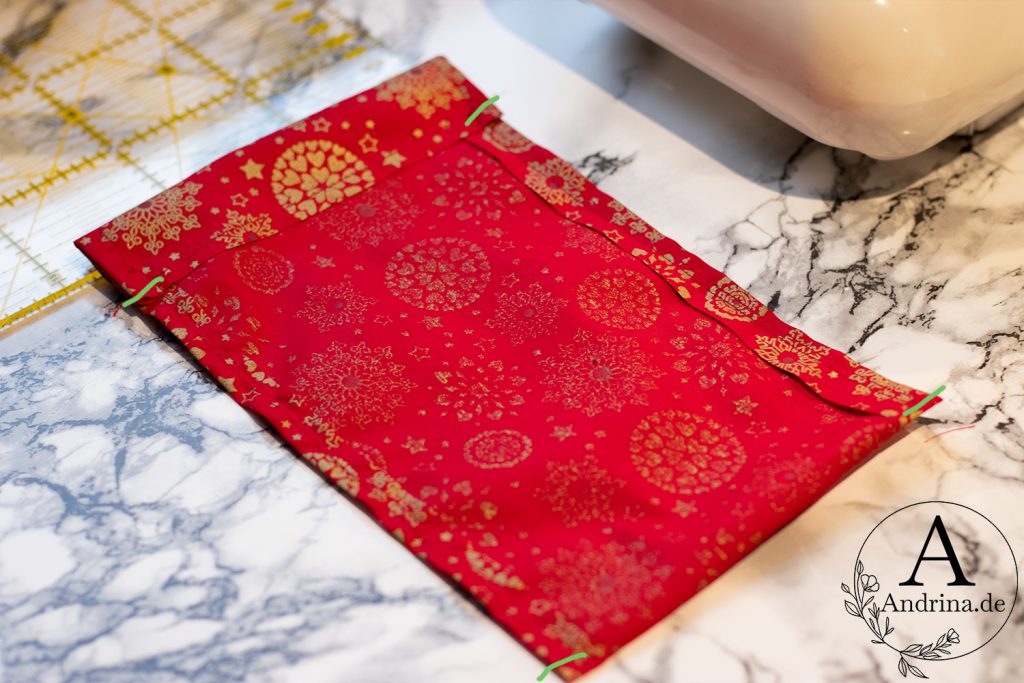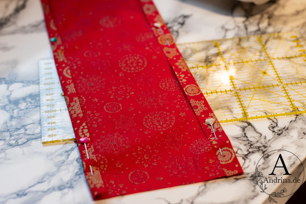 Anschließend legst du den Stoff mit der linken (also der „nicht so schönen“) Seite nach oben vor dich. Jetzt schlägst du die langen Seiten etwa 1 cm nach innen um. Steck sie mit Stecknadeln fest und nähe sie entlang dieser Kante ab. So bleibt der Stoff stabil und franst nicht aus.