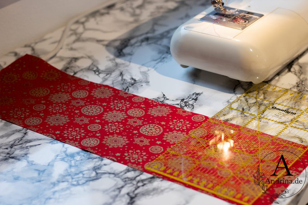 Zunächst überlegst du dir, welche Größe dein Geschenkbeutel haben soll. Für kleinere Geschenke eignet sich ein Stoffmaß von etwa 16 x 45 cm. Danach schneidest du den Stoff entsprechend zu.